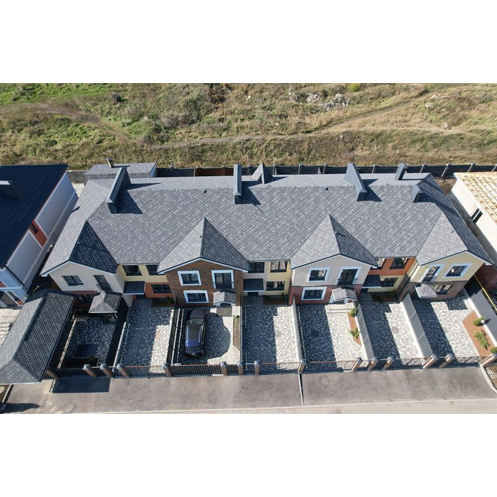 Черепица выполнена в глубоких графитовых оттенках. Она хорошо смотрится с фасадами в светлых холодных и теплых оттенках. Удачными будут и комбинации с насыщенными цветами, например, сайдингом «слива», «персик», «голубика».