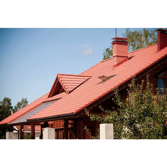 • Кровля защищена от механических воздействий, так как в основе металлочерепицы сталь толщиной 0.45 мм (с учётом металла, цинкового и полимерного слоя).