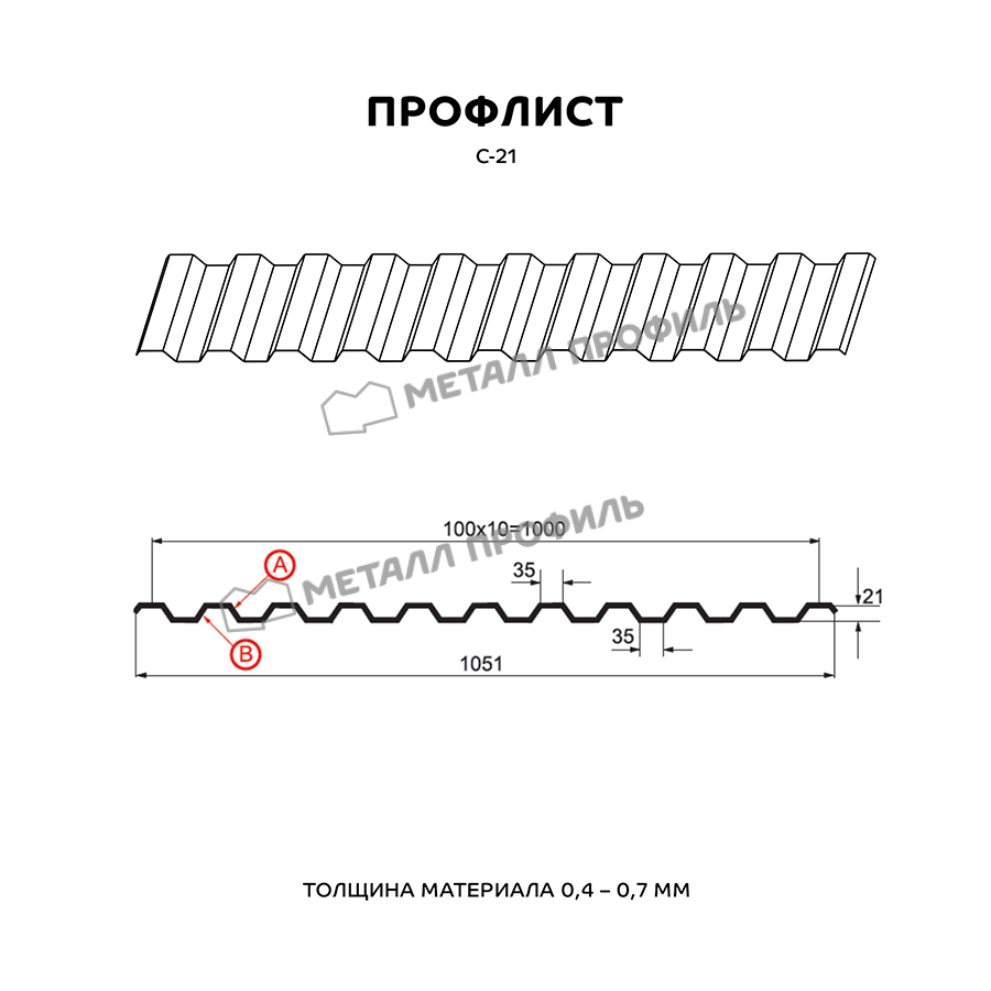 Профнастил с маркировкой С-21 следует понимать, как «стеновой» тип с глубиной профиля 21 мм. На самом деле, С-21 – один из наиболее универсальных стройматериалов, применяемый не только для фасадов. Он будет уместен как для обшивки стен, так и для обустройства кровельного покрытия, установки ограждений. С успехом С-21 находит применение в строительстве торговых павильонов, быстровозводимых зданий, складских помещений, а также в качестве элемента сэндвич-панелей. С-21 отлично подходит в качестве основы для Профилированного листа. Для этого он обладает хорошей несущей способностью. Довольно близко расположенные трапециевидные волны придают ему достаточную жёсткость. А симметричный рисунок гофры, идентичный с обеих сторон, обеспечивает Профилированному листу эстетичный внешний вид. В зависимости от назначения, мы можем выпустить профнастил С-21 с различной толщиной стали от 0,4 до 0,7 мм. Для повышения срока эксплуатации и внешней привлекательности, профилированный лист изготавливается с финишным покрытием различных цветов и фактур, включая покрытия под дерево, камень, кирпич.